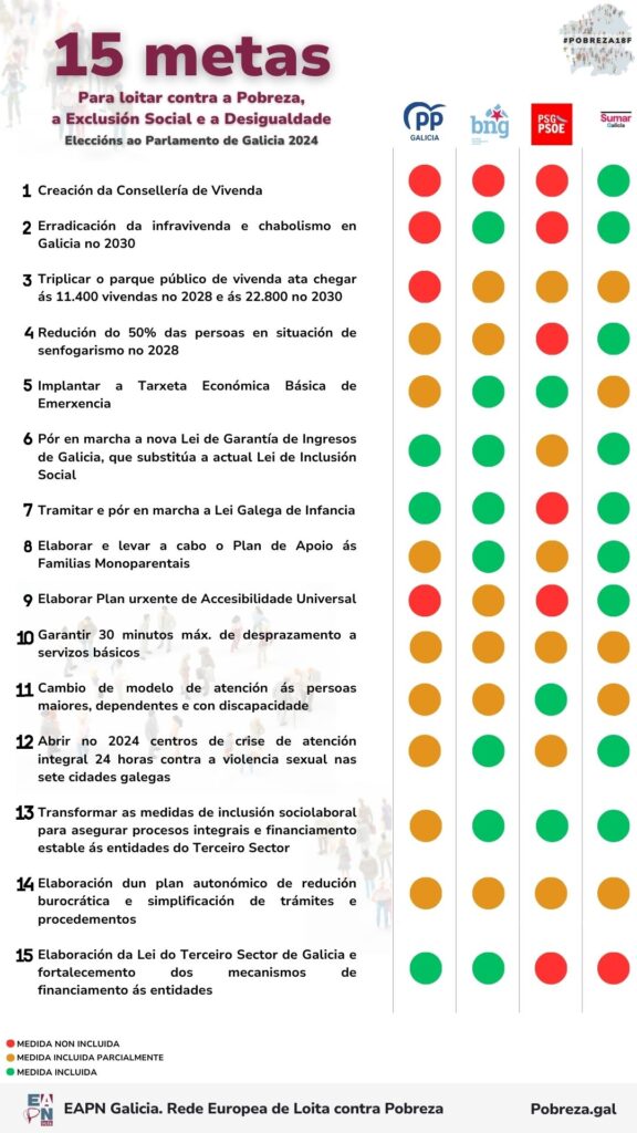 Dende EAPN Galicia realizamos unha análise dos programas electorais dos partidos políticos cos cales puidemos manter unha xuntanza na que lles foron trasladadas estas 15 metas. Velaquí o resultado da análise empregando unha lenda estilo “semáforo”.