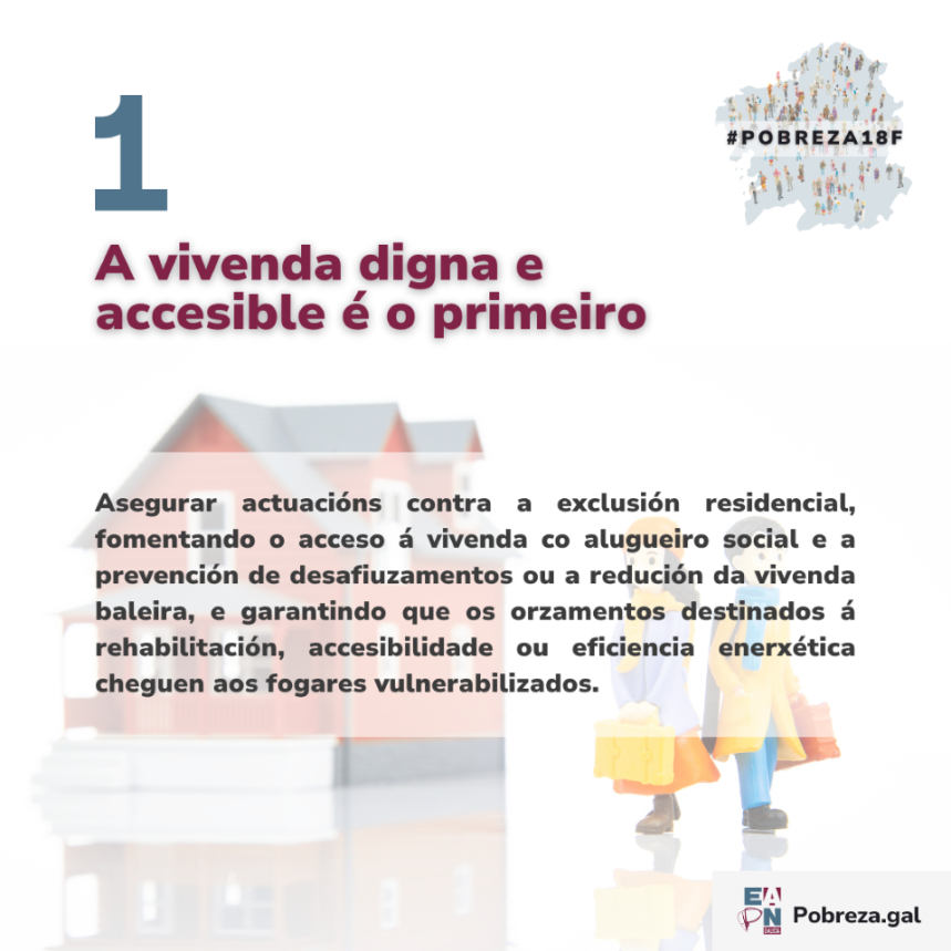 1. A vivenda digna e accesible é o primeiro. Asegurar actuacións contra a exclusión residencial, fomentando o acceso á vivenda co alugueiro social e a prevención de desafiuzamentos ou a redución da vivenda baleira e garantindo que os orzamentos destinados á rehabilitación, accesibilidade ou eficiencia enerxética cheguen aos fogares vulnerabilizados. Con medidas como triplicar o parque público de vivenda ata chegar ás 11.400 vivendas no 2028 e asegurar que se multiplique por 6, ata as 22.800 no 2030 e respostar con rigor a estas tres preguntas: cantas vivendas; onde van a estar e cando? Pero tamén co compromiso de erradicación do chabolismo e a infravivenda en Galicia no 2030 ou a creación dun parque básico de emerxencia con dúas vivendas de transición por cada 10.000 habitantes.