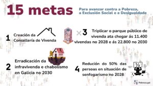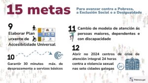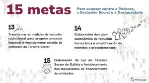 Entre as 15 metas destacan a elaboración dunha nova Lei de Garantía de Ingresos de Galicia, implantar a Tarxeta Básica de Emerxencia, un plan autonómico de simplificación burocrática, apoio ás Familias Monoparentais, unha Lei do Terceiro Sector de Galicia e o fortalecemento de mecanismos de financiación das entidades.