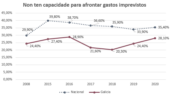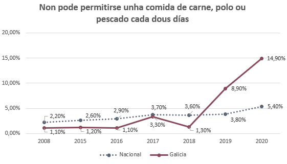 Pero a necesidade da afrontar o encarecemento da vivenda obriga tamén a unha priorización e eleción constante entre necesidades básicas. Esto detéctase claramente en indicadores como non poder afrontar gastos imprevistos (24,4% ao 28,1%) ou non poder permitirse unha comida de carne, polo ou peixe cada dous días (8,9% ao 14,9%).
