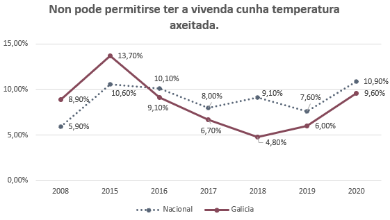 Así, a porcentaxe de persoas que manteñen retrasos no pagamento de gastos de vivenda principal incrementouse do 5,6% ata o 8,5% e o de quenes non poden manter a vivenda cunha temperatura axeitada aumentou tamén dende o 6% ata o 9,6%.