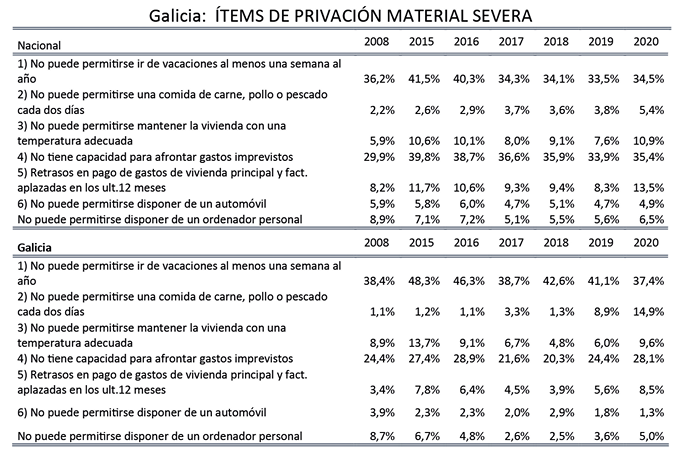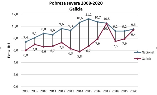 Esta fraxilidade, insistimos que anterior ao COVID, percíbese especialmente no aumento da pobreza severa. 253.000 persoas, o 9,4% da poboación, vivía con ingresos inferiores a 535€/mes nun fogar dunha persoa ou 1123€/mes no de dous adultos e dous menores). Unha porcentaxe superior ao do 2008 cando foi do 6% e a do 2019 que foi de 7,9%.