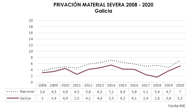 O impacto da pandemia percíbese claramente no aumento notable das persoas con carencias materiais severas. Do 3,6% ao 5,2% no 2020. Especialmente nas mulleres donde pasa do 3,6% ao 5,7% mentres a dos homes pasa do 3,7% ao 4,6%.