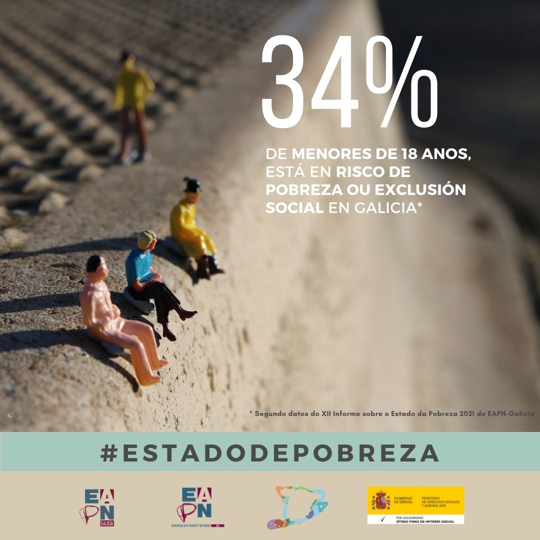 O risco de pobreza e exclusión infantil e xuvenil apenas diminúe. As cifras máis elevadas corresponden aos nenos, nenas e adolescentes (NNA), cuxa taxa alcanza ao 34%, case nove puntos sobre a que rexistran as persoas adultas (25,4%) e 15 puntos por encima da media no grupo de maiores que ven mellorada a súa situación pola estabilidade das pensións.