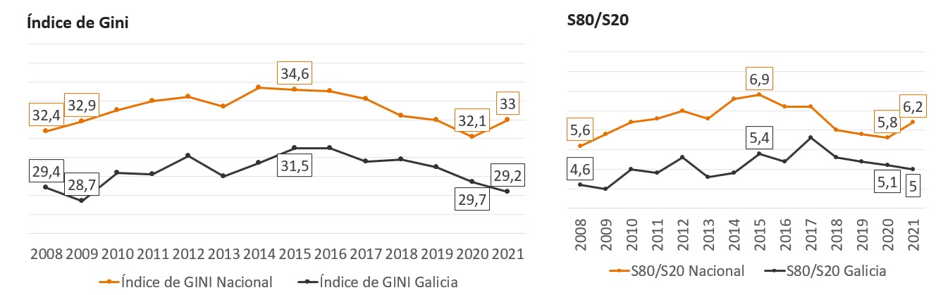 A taxa de pobreza galega diminúe e pasa do 22,1% ao 20,2% no 2021. Esta redución volve situala por baixo da media nacional, que aumenta lixeiramente no mesmo período (do 21% ao 21,7%). O decrecemento da taxa nos homes foi de 2,3 puntos e nas mulleres de 1,4 puntos, un 11% e un 6,4% respectivamente.