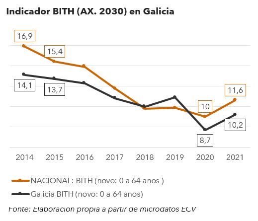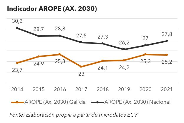 Os indicadores, en especial o de pobreza, mantéñense por debaixo dos do conxunto do estado, onde a taxa AROPE aumenta do 27% no 2020 ao 27,8% no 2021. Coa leve diminución de 1.000 persoas da taxa AROPE dende o 2015, avánzase na meta do Plan Estratéxico Galicia 2022-2030 de reducir no 2030 ao 14%. Sempre que non se free o esforzo orzamentario contra os efectos da crise motivada pola inflación e o aumento de prezos, sobre todo de produtos básicos e enerxéticos.