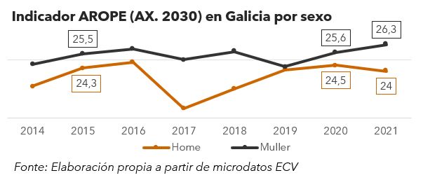 Agrávase a feminización da pobreza. Das 678.000 persoas que no 2021 estaban en risco de pobreza e/ou exclusión social, 311.000 eran homes (12.000 menos que no ano anterior, 0,9 puntos menos) e 367.000 mulleres (8.000 e 0,7 puntos mais). En especial en fogares monoparentais (54,3% en risco de pobreza ou exclusión) ou de persoas maiores soas.