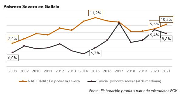 A taxa de pobreza severa (con ingresos máximos de 530€ mensuais nun fogar dunha persoa ou 1.112€ no de dous adultos e dous nenos ou nenas), tamén diminuíu, do 9,4% ao 8,8%. 237.769 persoas, 16.000 menos que no ano anterior. Pero cunha gran diferencia por sexo: a taxa foi do 8,6% para os homes (fronte ao 10,2% do ano anterior) e do 9% para as mulleres (8,7% no 2020)