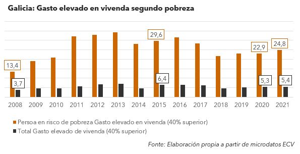Todos os parámetros certifican o agravamento da emerxencia residencial e de acceso a unha vivenda digna, axeitada e accesible: o 24,8% das persoas en pobreza dedican mais do 40% da súa renda dispoñible a gastos de vivenda (o 22,9% no 2020), o 19,5% gasta mais da metade da súa renda. Datos que se agravan nas familias con menores.