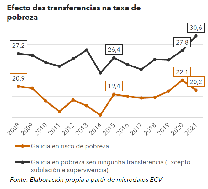 A taxa de pobreza elevaríase un mínimo de 4,9 puntos (ata ao 25,1%), 127.000 persoas, sen as medidas extraordinarias de política social implantadas para combater os efectos da pandemia, tanto de goberno central (ERTE, IMV, etc.) como da Xunta de Galicia (RISGA, Tarxeta Básica, etc.). Se non existira ningunha medida pública (agás pensións de xubilación) de loita contra a pobreza e a exclusión, a taxa de pobreza subiría do 20,2% ao 30,6%.