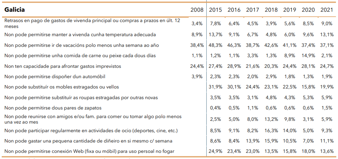 Dentro dos elementos que compoñen o indicador de Privación Material e Social Severa melloran os vinculados con medidas de inclusión social, como a Dificultade para afrontar gastos imprevistos (do 28,1% ao 24,7%) ou especialmente o de Non poder permitirse unha comida de carne polo ou peixe cada dous días, que baixa do 14,9% ao 2,1%, demostrando o éxito incontestable de medidas como a Tarxeta Básica para adquirir de xeito áxil produtos de primeira necesidade (alimentos, hixiene e farmacia) a familias en pobreza ou privación severa.