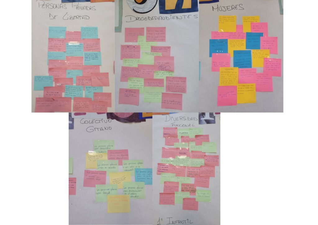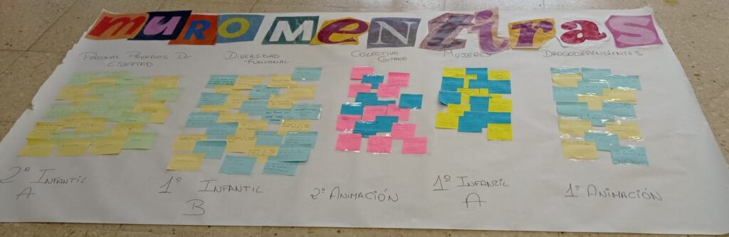 Os e as participantes se enfrontaron a unha tarefa intrigante: escribir en post-its os prexuízos que lograran desmantelar, agora apoiados por información verídica proporcionada polo equipo. Os estudantes foron animados a compartir as súas propias experiencias, aquelas que desafiaban os estereotipos mencionados anteriormente. Ao final, todos estes post-its, cargados de percepcións transformadas e relatos inesperados, foron recompilados para crear dous muros: un cos prexuízos e outro desmentíndoos, transformando así as ideas preconcibidas negativas en realidades enriquecedoras e, quen sabe? talvez mesmo inspiradoras.