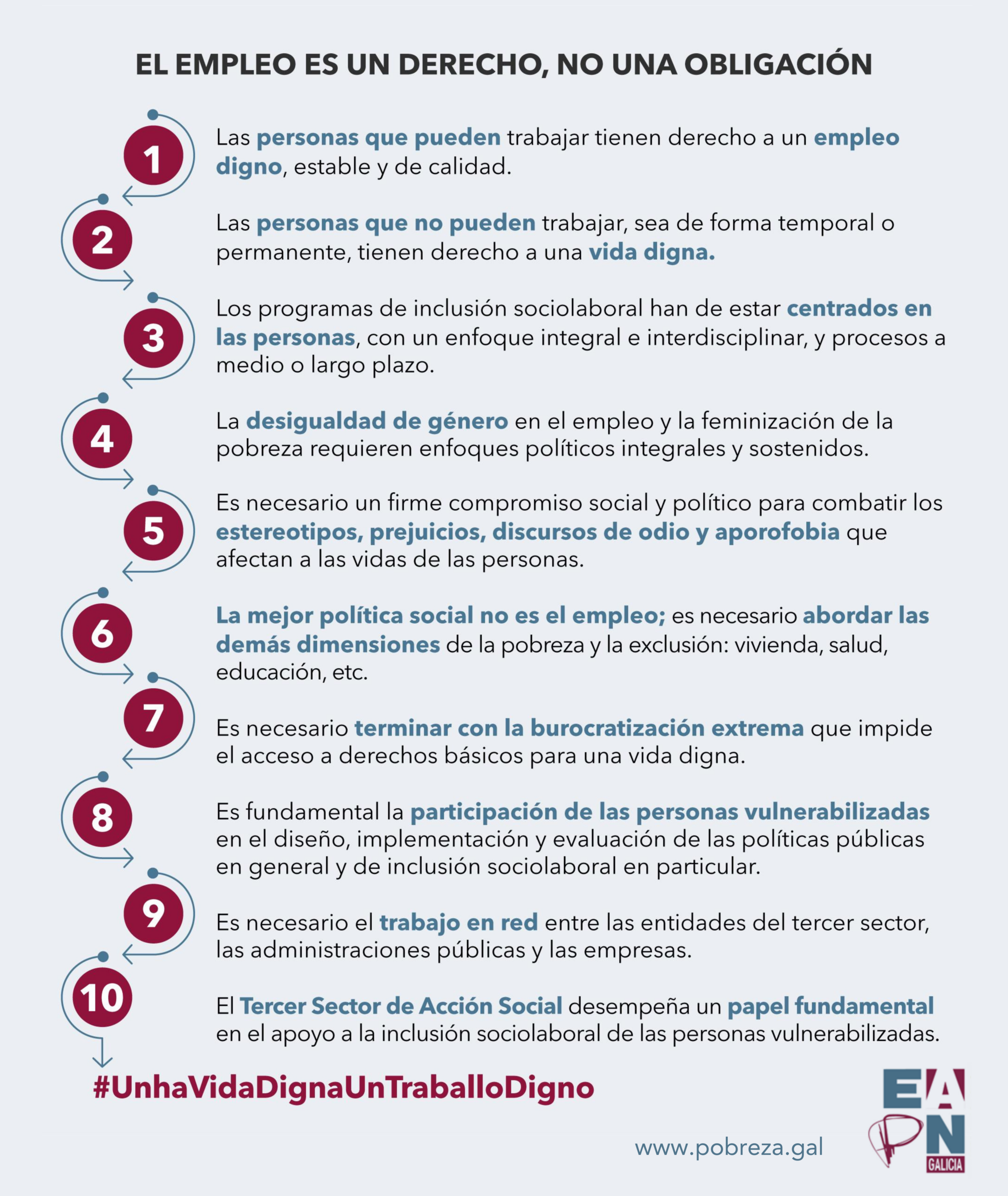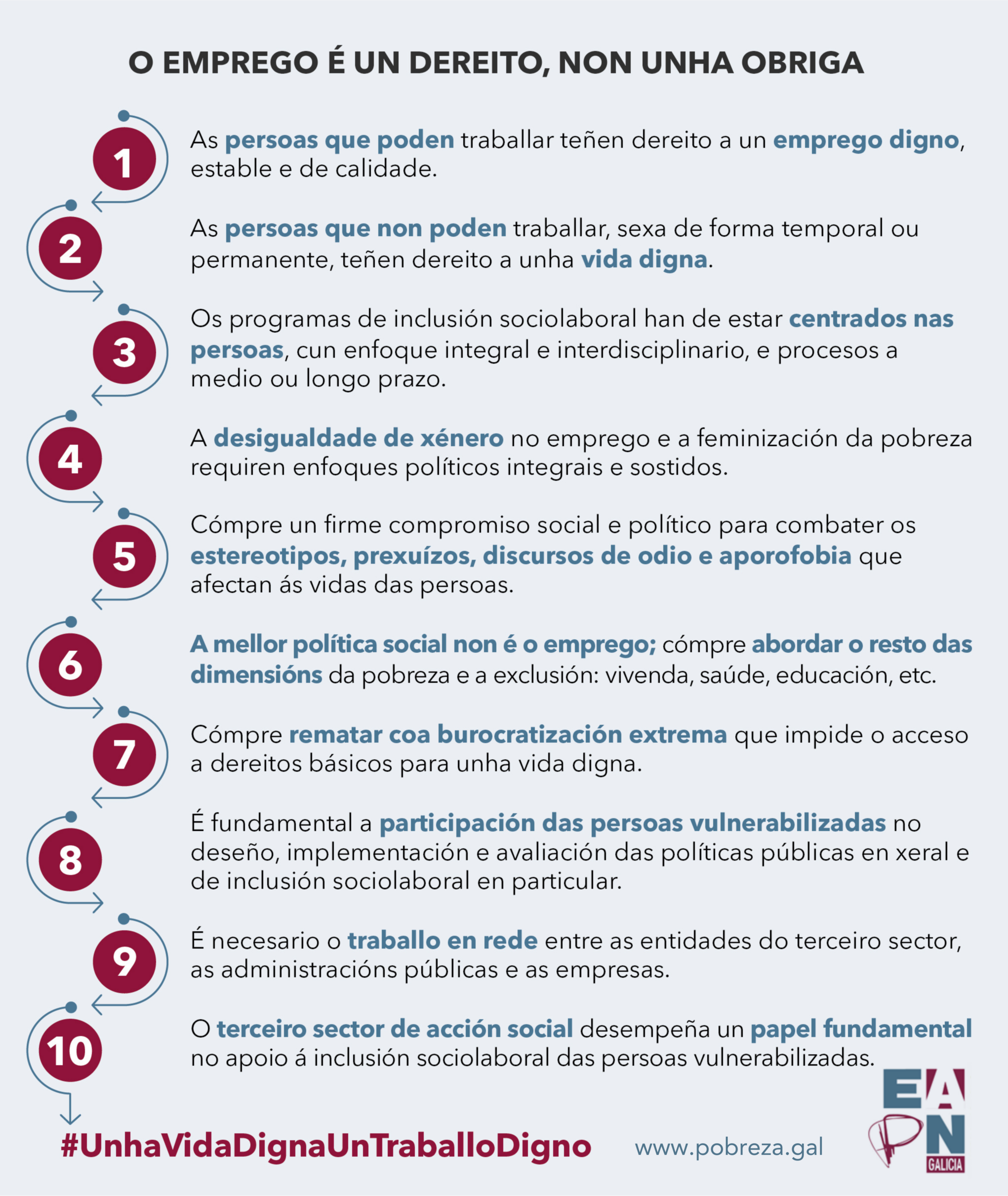 Na banda das propostas políticas, “presentamos claves de mellora das políticas públicas para que estes programas poidan resultar eficaces. Incluso as resumimos no Decálogo titulado“O emprego é un dereito, non unha obriga” informa a presidenta de EAPN Galicia.