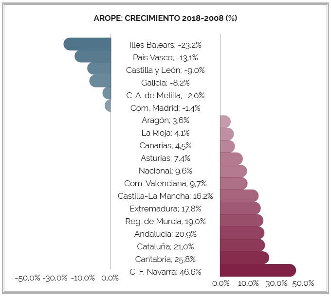 A pesares do incremento, Galicia é unha das cinco comunidades autónomas que conseguiu reducir a súa taxa AROPE a cifras inferiores ao comezo da crise, do 25,1% no 2008 ao 23% no 2018.