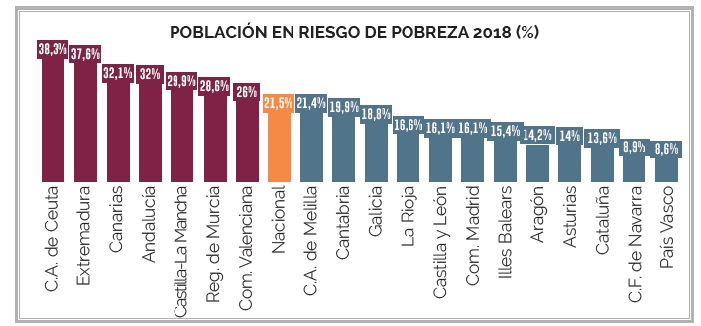 No ano 2018, a taxa de pobreza relativa de Galicia mantívose en termos semellantes ós do ano anterior, aumentando unha décima (pasando de 18,7 a 18,8). En termos absolutos, Galicia ten unhas 508.000 persoas, 1.000 más que o ano anterior, en risco de pobreza. Debe destacarse que nos últimos tres anos de recuperación económica, a taxa de pobreza en Galicia practicamente se mantivo inmóbil. Ainda así, esta taxa segue a ser inferior ao promedio estatal, situado no 21,5% da poboación.