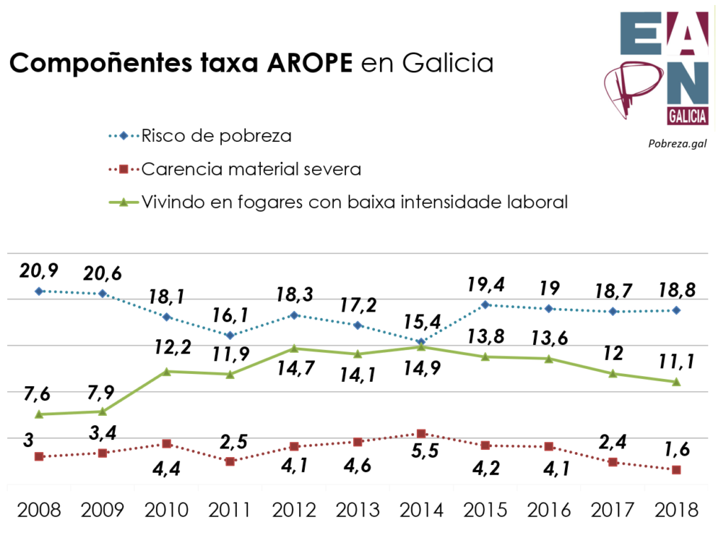 Galicia é unha das seis comunidades autónomas que conseguiu reducir a súa taxa AROPE a cifras inferiores ás do comezo da crise. Sen embargo debe destacarse que nos últimos tres anos, de notable recuperación macroeconómica xeral, a taxa de pobreza en Galicia practicamente mantívose inmóbil.