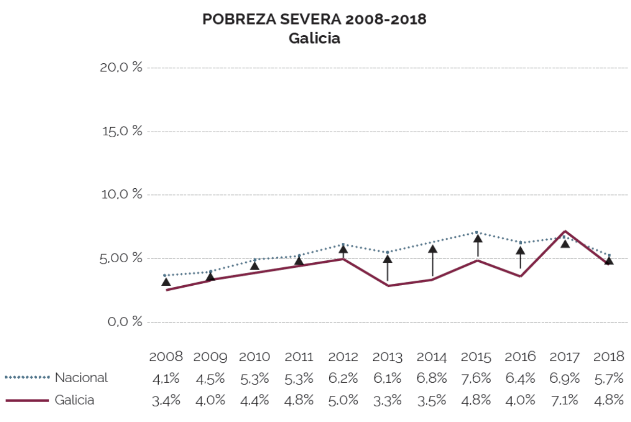 O 4,8% da poboación galega, 128.000 persoas, atopábase no 2018 en situación de pobreza severa, esto é, con ingresos inferiores a 370€ mensuais (4.440€ ao ano para un fogar dunha persoa). Cunha redución importante respecto ao incremento sufrido o ano anterior, co cal a cifra volve a unha posición históricamente máis habitual, por debaixo da taxa da media nacional (5,7%).