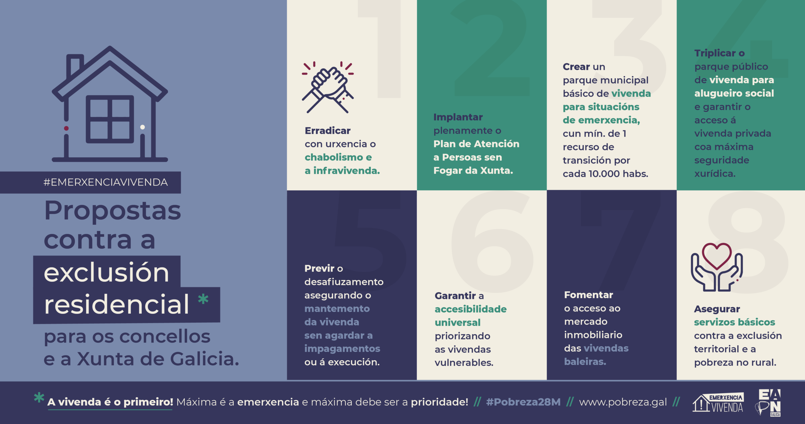 Ante a gravidade da emerxencia do acceso a unha vivenda digna e accesible que xa afecta á maioría das persoas en pobreza, as principais propostas e medidas adícanse a asegurar a inclusión residencial. Incluíndo a esixencia de máxima concreción nesta materia ás diferentes candidaturas electorais.