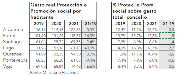 O Ministerio de Hacienda publica anualmente e coa información facilitada dende cada concello galego, tanto o detalle do orzamento municipal como especialmente a execución real por cada partida orzamentaria, entre o que se inclúe a de Actuacións de protección e promoción social, que agrupa o gastos en servizos sociais e fomento do emprego. Nesta ligazón estan dispoñibles os informes de execución orzamentaria ata o 2021.