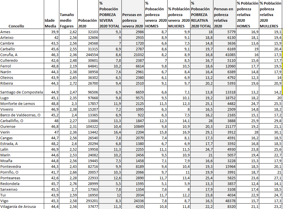 Dende finais do 2022 xa está dispoñible na páxina web do INE o Atlas de Distribución de Renta de los Hogares, con mapas e indicadores de nivel e distribución de renda por persona e fogar ao nivel de sección censal, a división administrativa máis detallada do territorio. Están xa que logo dispoñibles para cada barrio e concello galego datos como pobreza severa e relativa, pobreza infantil, desigualdade (indice Gini), renda media por persoa e fogar, etcétera.