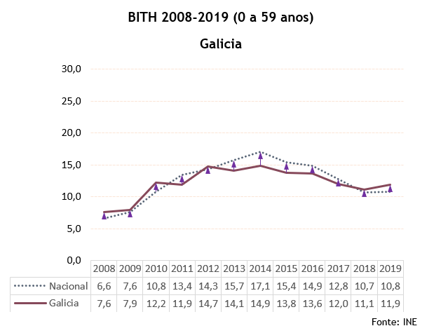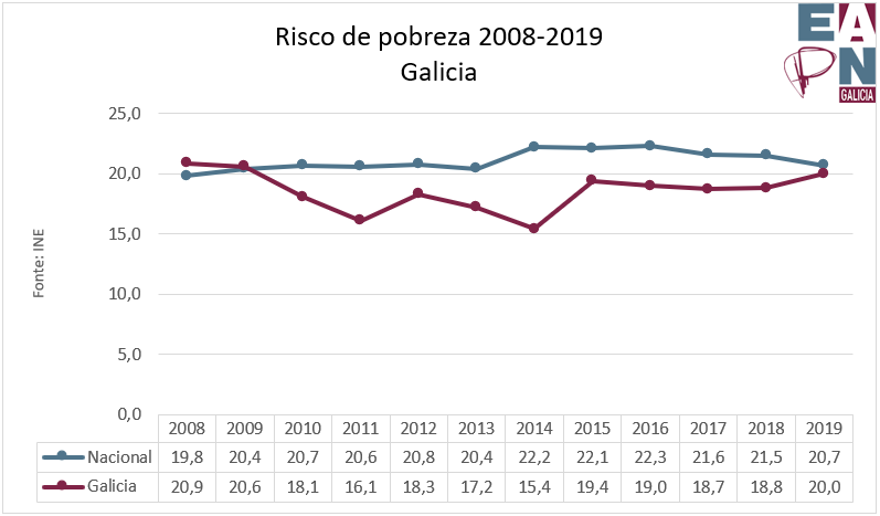 incremento de algo máis dun punto porcentual: 540.729 persoas (31.623 máis que no ano anterior). Con todo, no conxunto do período entre 2008 e 2019 a taxa diminuiu 9 décimas, o que supuxo que 35.000 persoas saíran dunha situación de pobreza.