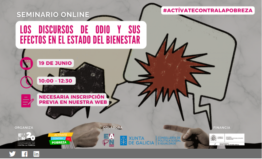 O pasado 19 de xuño, EAPN Galicia participou, xunto con EAPN España, na organización do seminario en liña “Os Discursos do odio e os seus efectos no Estado do Benestar”. O obxectivo do Webinar foi o de analizar como os discursos de odio están a ser empregados no contexto actual, afectando á garantía dos dereitos fundamentais daquelas persoas que se atopan nunha situación de vulnerabilidade.