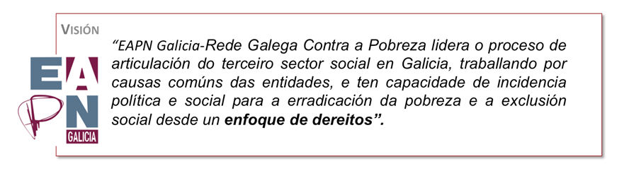 Traballar polas mesmas causas, ter capacidade de incidencia política e social para a erradicación da pobreza e a exclusión social desde un enfoque de dereitos e liderar o proceso de articulación do Terceiro Sector Social en Galicia, claves do novo Plan Estratéxico de EAPN Galicia 2016-2019.