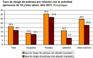 O Instituto Nacional de Estatística (INE) publicou os datos da Enquisa de Condicións de Vida da poboación española para 2011. Segundo este informe, o 21,1% da poboación atópase por baixo do limiar de pobreza este ano, fronte ao 21,8% de 2011, un descenso de sete décimas que se explica polo efecto da estabilidade dos ingresos dos maiores de 65 anos, a pesar da redución dos percibidos polo resto da poboación.