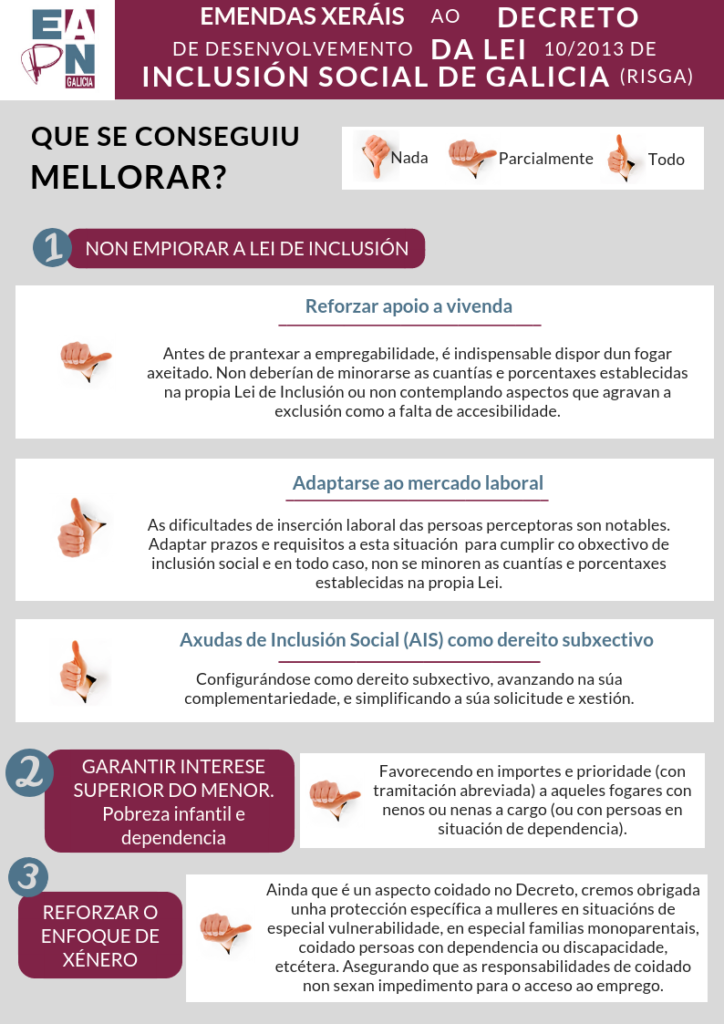 Culmina así, con case cinco anos de retraso sobre o establecido na Lei, un proceso constante de incidencia política realizado dende EAPN Galicia e as súas entidades membro presentando emendas durante todo o proceso de diálogo, interlocución e exposición pública que trataran de mellorar a calidade de vida das persoas perceptoras da RISGA.